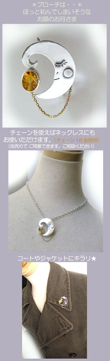 ●BRC_03● SOLD OUT ![]() ココロが和みそうな表情のお月さまに、 珍しいカットのシトリンを配したブローチ、 そして、、、 流れ星をイメージしたコサージュのセットです。 ちょっと、夢見心地〜な気分で作りました。 お月さまの放った光の残像をイメージしたゴールドのチェーンが キラキラとゆれます♪ お月さまのブローチは別の石等で オーダーでお作りできますが、 (現品と同じカットの石は在庫にございません) 流れ星コサージュは現品のみの1点ものになります。 いろんな使い方を楽しんでくださいね! <この石について> ***シトリン*** 富と財産の石。金銭感覚を磨き、金運を上昇させてくれる石といわれいます。 緊張を和らげるこうかもあるとか。。 ![]()