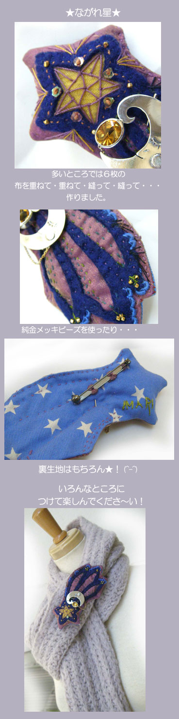 流れ星のパープルの生地は 冴えたパープルの生地にオーガンジーを重ねて きらきらしています。 残念ですが、画像にはうまく写りませんでした・・・残念! ![]() 流れ星は、 純金メッキビーズ、スパンコール、 フエルト、オーガンジー、コットン、ナイロン起毛生地等 を使っています。