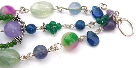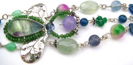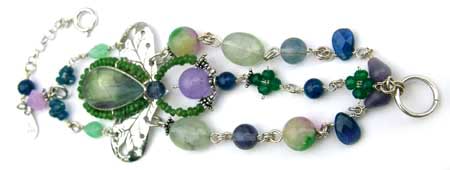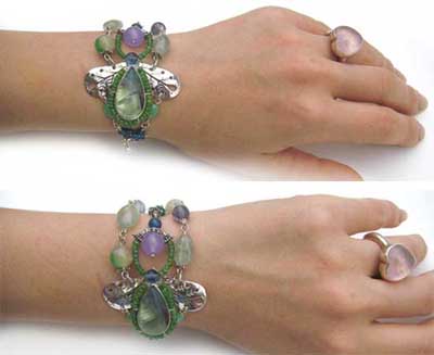 | 森の妖精の仲間入りが出来ちゃいそうな!?新緑の香りが漂ってきそうな・・・ 作り手の思い込みいっぱいのイメージです。 バイカラーのフローライトを中心に、グリーン〜ブルーのお色でまとめたブレスレットです。 着けた時、トップ部分がくるっと回っちゃうことのない作りになっています。(1点もの) センターの枠に入った石は、バイカラーフローライト 恋愛に効果のある石・・・違う環境で育った2人を結びつける力があるといわれています。 人間関係にも効果的で、性格の会わない人とも問題なく接することが出来るようになるとか・・・ |