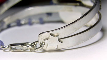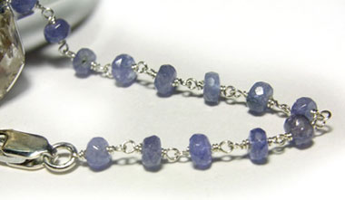 「夜明け前の空の色」のイメージで配したタンザナイトのチェーンは カチッとしたバングルに動きを出してくれます。