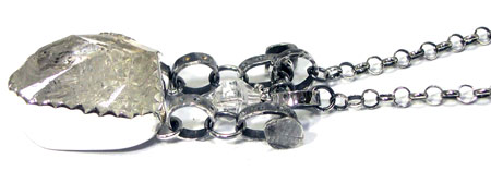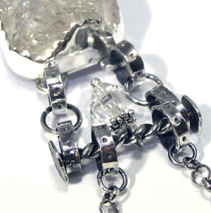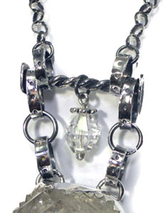 クールでかっこいい♪ネックレスです。 <この石について> ***ハーキマーダイヤモンド*** アメリカで産出する宝石の中でも珍しいものとして、ハーキマーダイヤモンドが存在します。 世界でもニューヨーク州ハーキマー地区でのみ産出する天然クォーツで、 通常は柱状に成長するのですが、ハーキマーのみ粒状に成長し、 ダイヤモンドの八面体結晶に似た、美しい六面体結晶となります。 ハーキマーで産出される輝きが強いクォーツに与えられた『ハーキマーダイヤモンド』の名称は、 かつてはダイヤモンドと誤解を受ける誤称とされましたが、 現在はクォーツの中でも特別な宝石として名称が定着しています。 柱状結晶から部分的に研磨されるクォーツと違い、 砂岩の中にある空洞で粒状に成長するハーキマーダイヤモンドは、 その自然の造形を楽しむものとして一切の研磨や人工的処理を行いませんので、 自然の創り出した宝石の奥深さが伝わってきます。 ひとつとして同じ宝石が見つからないハーキマーは、 完全な天然自然の創造物となる神秘的なクォーツです。 ただし、商業的に採掘されている宝石ではなく、まとまった採掘がない為に流通数が限られています。 古代では魔術的な力があると信じられ、 またその輝きから希望を象徴し、霊感力、直感力を高めると言われています。