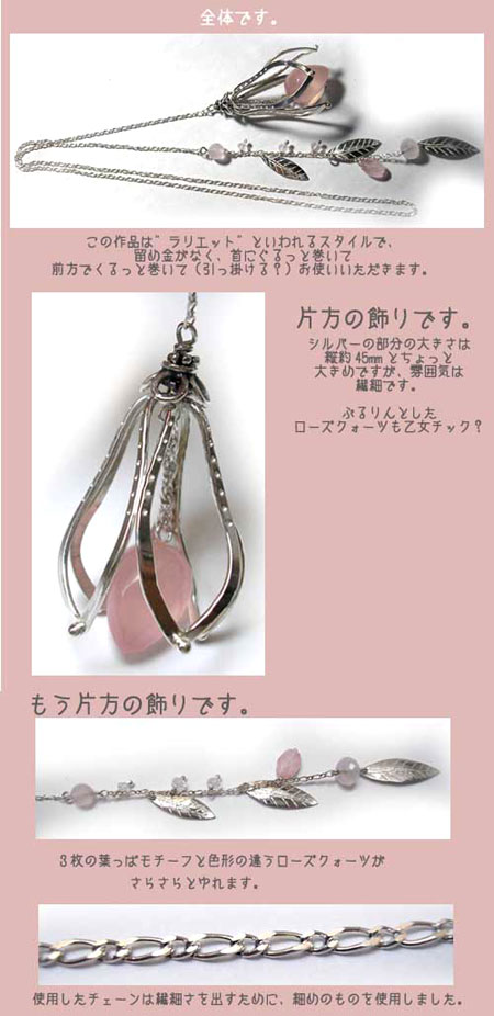 ●N_Neck37● SOLD OUT ![]() お客様のお問い合わせにお応えして、ラリエットの登場です! 繊細な雰囲気を持ちながら、大きめのお花がしっかり主張します!! 自作の葉っぱモチーフがさらさらと揺れます(^-^) 使用石はすべてローズクォーツです。 ***ローズクォーツ*** 慈愛・優しさ・和やかさを象徴し、持つ人を柔らかな波動で包み、 感情面での安定を促して、若さと健康を保つ力があるといわれており、 心身のバランスを保って不安や恐怖から解き放つとも伝えられています。 ●詳細● ![]()