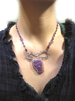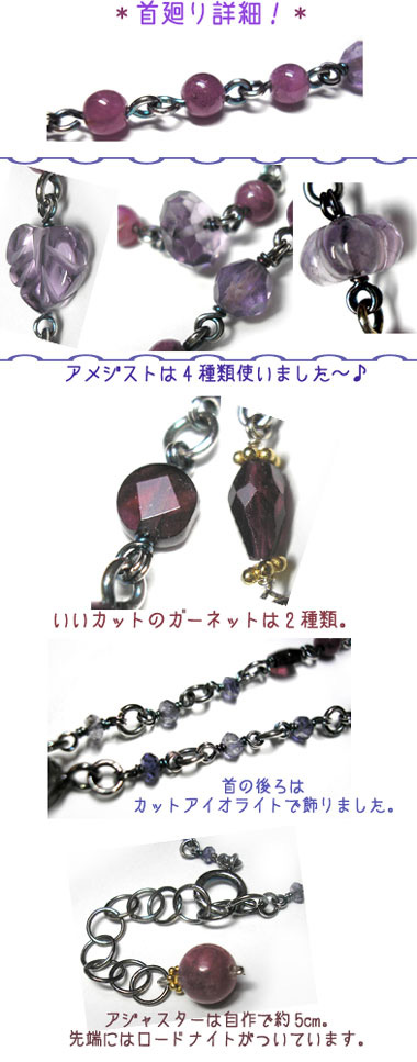 ●N_Neck39● SOLD OUT ![]() グロースラインと呼ばれる結晶の成長過程で生じた、 表面に見える三角形の模様をはっきりと見ることができる、 原石のルビー(和名は紅玉)をセンターに、ブロンズで飾りました。 エキゾチックな雰囲気漂うネックレス♪ 首廻りにもルビー、アメジスト、ガーネットを配し、 大人っぽい色合いです。 <インドルビー> 着けている人を魅力的に輝かせ、 目的に向かって行動する勇気をくれる情熱の石といわれています。 <アメジスト> 気品に満ちた高貴な輝きを放つ紫の石アメジストは 「愛と真実と情熱と受難と希望」を表す石といわれ、 心に不安を抱える人には慈悲と癒しのパワーで心の傷を取り除き、 安らぎを与えてくれます。 また、感情をコントロールし真実の愛を与えてくれます。 紫の美しい色に包まれる様子をイメージすれば、自信と勇気が湧き上がり、 ワンランク上の自分へと導いてくれるかも! <ガーネット> 持つ人に変わらぬ愛情が保証され、忠実さや貞節を守る力があるといわれています。