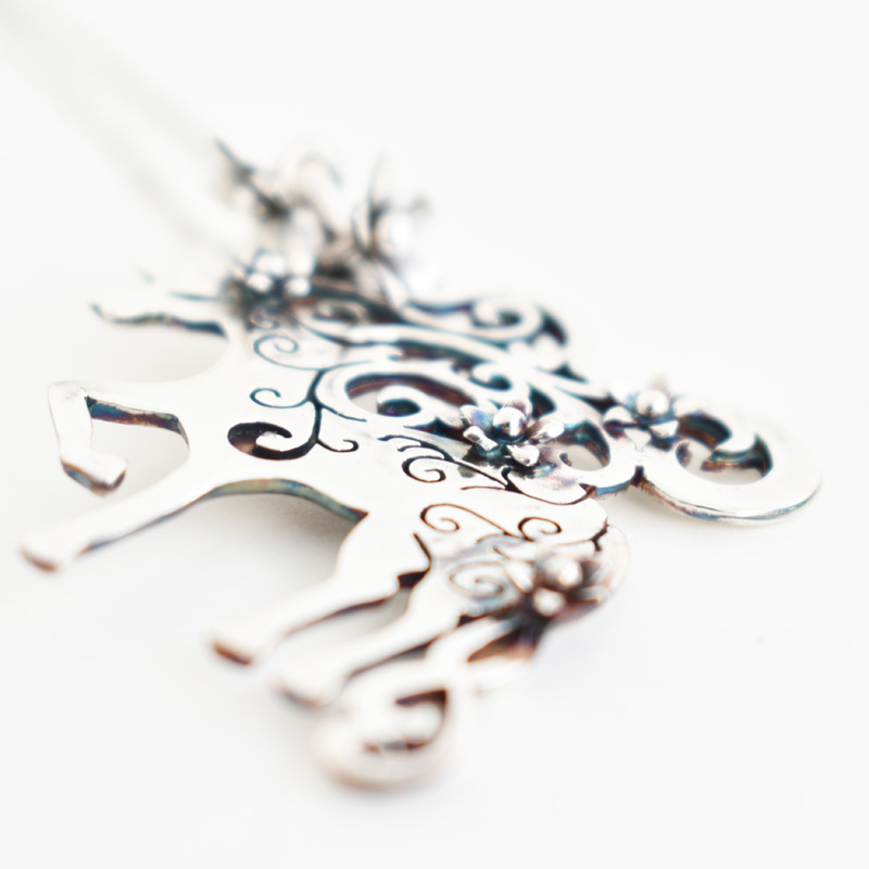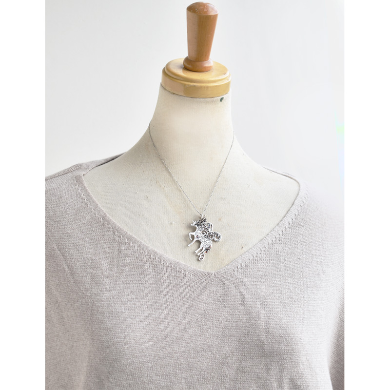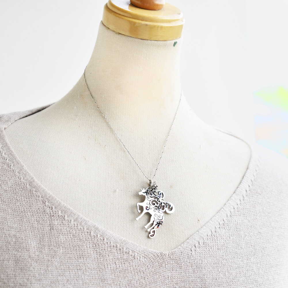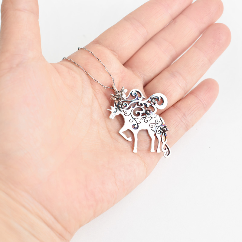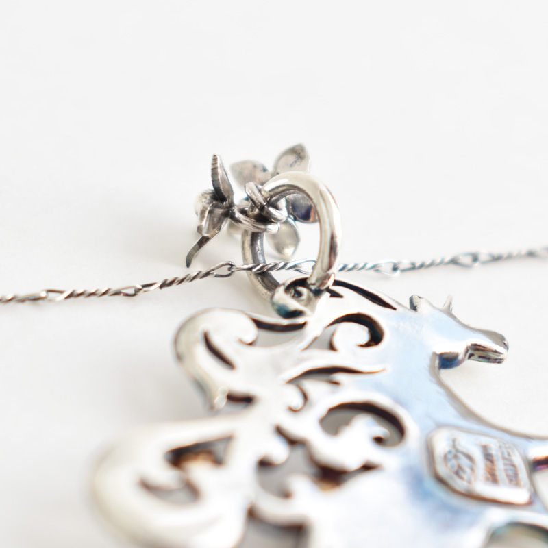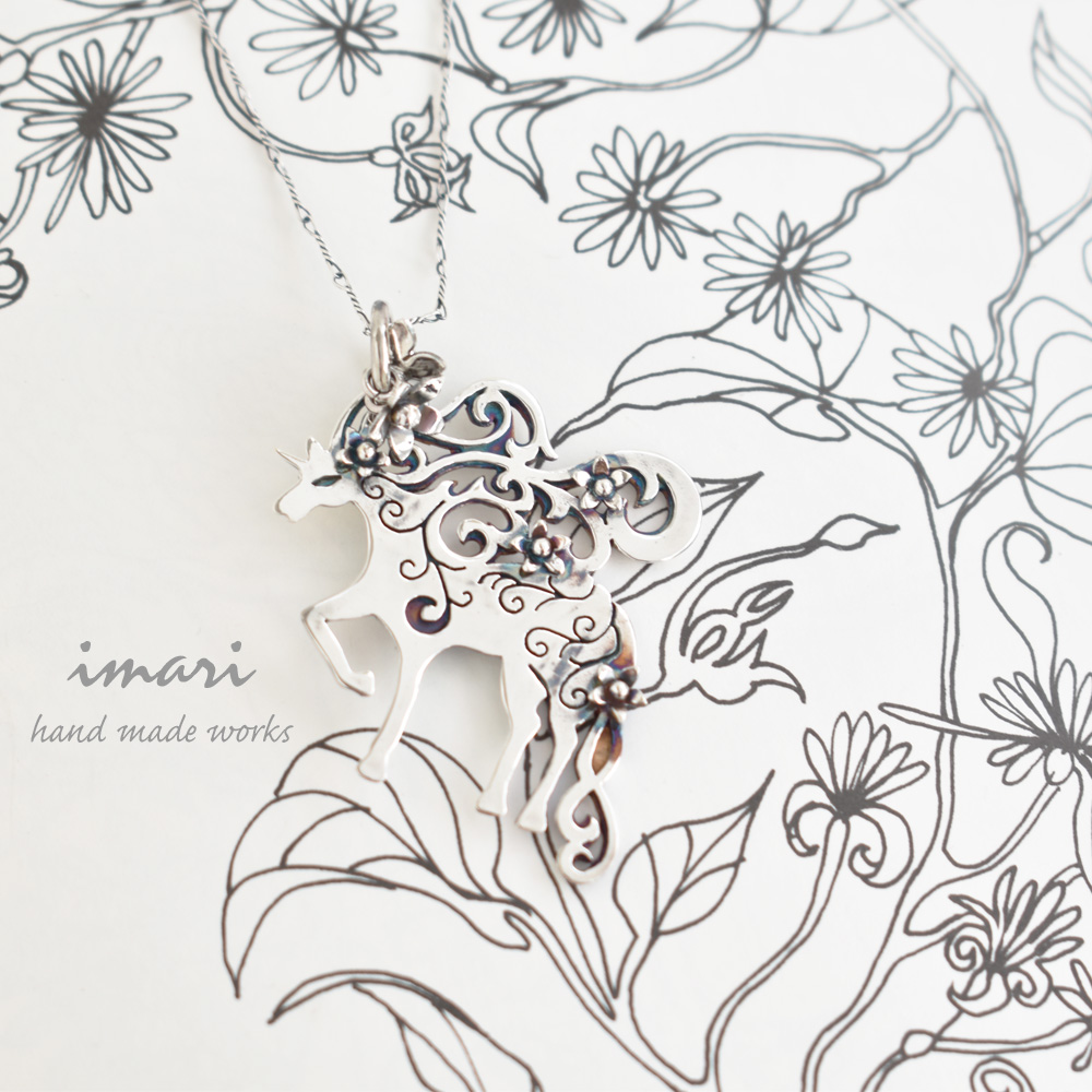お客さまより、お預かりしたイメージ画より デザインを起こし、生まれました やさしいしい表情に、お花を散りばめたデザインの ユニコーンモチーフの、ペンダントトップです。 ----------------------------------- 伝説の動物一角獣=ユニコーン ------------------------------------ いろいろな言い伝えののあるユニコーン。。。 一説では、 古代ギリシャ紀元前400年頃の クテシアスにまで遡り、 その角にはあらゆる病気を治す(癒やす)と 伝えられ、 その姿同様癒やしを与えてくれる そんな存在です。 複雑なデザインゆえ、 ユニコーンの本体は、お客さまのご了承を得て 型取りし、鋳造いたしました。 ------------------ 鋳造につきまして ------------------ 彫金の技法で制作した作品の 専門の業者さまに 型どり後、シルバーを流していただいています。 ネックレスを通す部分であります、 2輪のお花をバチカン部分は 糸鋸を使い、自身の手作業により 銀の地金板から切り出して制作しています。 バチカン(チェーンを通す部分)は 大きめにデザインいたしましたので、 リボンやいろんなネックレスに通してお楽しみいただけます。 (チェーンを通す部分の内径は約6mmです。) 大きめな画面ですが、 おつけする繊細な40cmチェーンを含め 重さは10g以下(約9.2g)と軽量です。 ーーーーーーーーーーーーーーーーーーーーーーーーーーーーーー ・素材 Silver925 Silver950 Silver980 チェーン Silver 925 ・サイズ 縦:約50mm(バチカン含む) 横:45mm(いずれも最大値) チェーン40cm ーーーーーーーーーーーーーーーーーーーーーーーーーーーーーー 販売中の作品は、 他ショップサイトにて、同時にご紹介しておりますため お譲りできない場合もございます。 なにとぞ、ご了承くださいませ。 ☆ご不明な点がございましたら、お気軽にお問い合わせください☆ ーーーーーーーーーーーーーーーーーーーーーーーーーーーーーー ☆ |