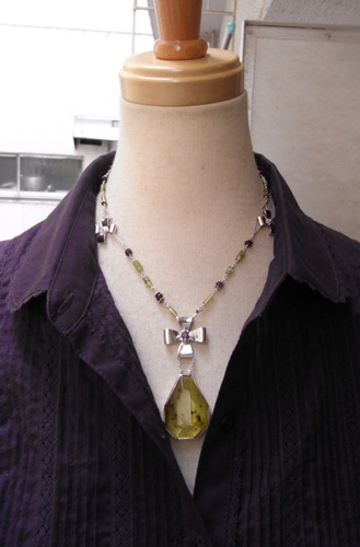 初入荷のグリーンアンバーとアメジスト・ペリドットで 王家のジュエリーをちょっと意識したニュアンスのネックレスを作りました。
