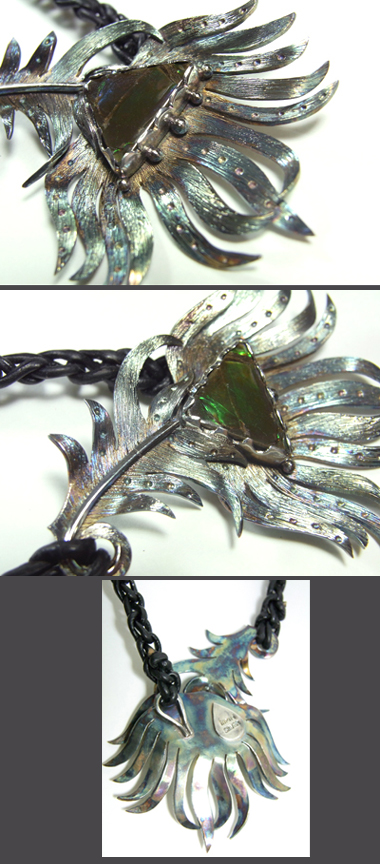 そのアンモライトを、孔雀の羽のモチーフのネックレスに仕上げました。