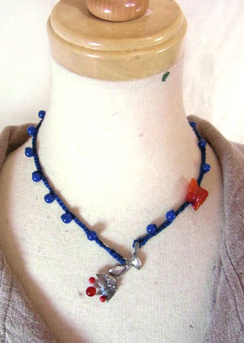 【Red & Blue】 カーネリアン & ブルーメノウ の ビビットカラーと、首周りはかろやかなコットン糸で編んだネックレスができました☆ おとなかわいいネックレスです♪