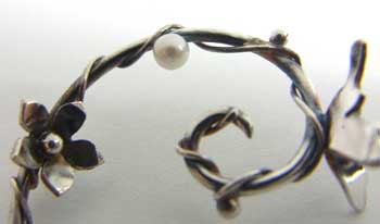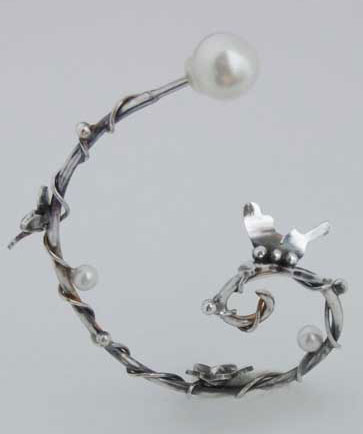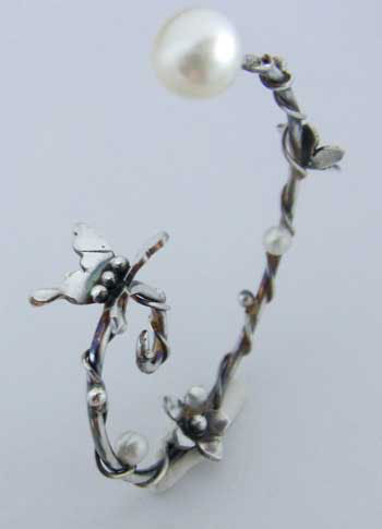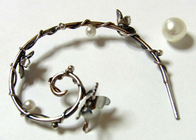 | 呼び声の高いフープタイプのピアスに ちょっと立体的にとまった蝶ちょさん・お花・つるとしずくの輝きのようなパールを、 森のワンシーンのように飾りました。 キャッチは、今回初入荷の「パールキャッチ」を採用しましたので ピアスの向きを変え2タイプのニュアンスを楽しめます♪ パールキャッチについては下記にご説明あります。^^ <<<<こちらのピアスは片方(1個)での販売です>>>> |