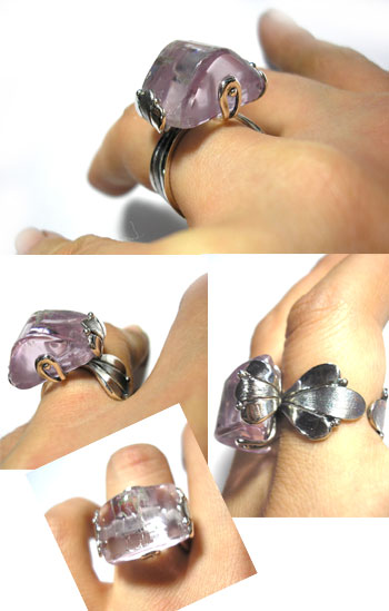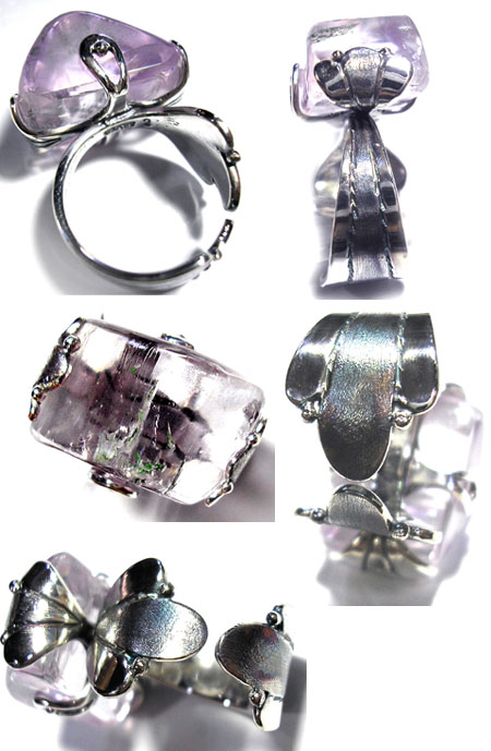 上品な色の原石に近い形のクンツアイトを配した、 ころっとリングに近い?(^-^)リングです。 石を止めている部分に植物的なモチーフにし、 ちょっとと不思議なニュアンスです。 ***クンツァイト*** 透明感のある、ライラックピンクがキレイです。 アメリカの宝石の権威者、クンツ博士の名に因んで名付けられました。 無限の愛、自然の恵み、純化された存在を表す石とされ、 浄化力を持ち、肉体と精神、感情のバランスを安定させると言われています。