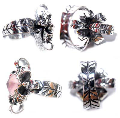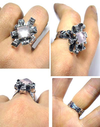 葉っぱの重ねモチーフで飾りました。 立体感のあるリングです。 <この石について> ***ローズクオーツ*** 慈愛・優しさ・和やかさを象徴し、持つ人を柔らかな波動で包み、 感情面での安定を促して、若さと健康を保つ力があるといわれており、 心身のバランスを保って不安や恐怖から解き放つとも伝えられています。