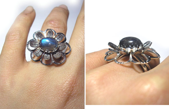 ちょっとレースを思わせる透かし立体?(^-^)な、お花モチーフに 落ち着いた色合いのラブラドライトを配し、 お花モチーフながら甘くない!印象のリングです。 <この石について> ****ラブラドライト***** (不要なノイズからシールドし、直感力、洞察力をもたらすといわれています)