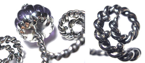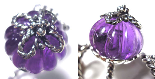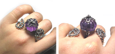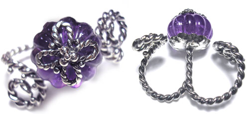 SOLD OUT ![]() コロンとしたかぼちゃカットの大粒、アメジストを 大人っぽい雰囲気の Wリング(2本の指につけるリング)にしました♪ 類似の石の在庫はございませんので1点ものとなります。 <この石について> ***アメジスト*** 気品に満ちた高貴な輝きを放つ紫の石アメジストは 「愛と真実と情熱と受難と希望」を表す石といわれ、 心に不安を抱える人には慈悲と癒しのパワーで心の傷を取り除き、 安らぎを与えてくれます。 また、感情をコントロールし真実の愛を与えてくれます。 紫の美しい色に包まれる様子をイメージすれば、自信と勇気が湧き上がり、 ワンランク上の自分へと導いてくれるかも! ******Wリングについて***** 薬指と中指におつけいただくのがオススメです。 つけ心地をご心配される方も多いのですが、 薬指、中指はあまり普段広げることがなく、 握る部分は太くないので、着け心地もとてもいいですよ。
