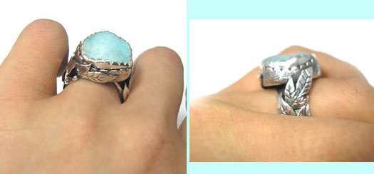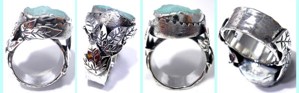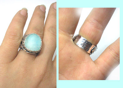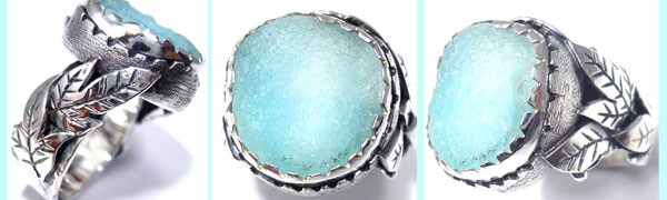 ●N_Ring112● SOLD OUTありがとうございます! ![]() きらきらの結晶メノウを、2重の枠でワイルドに包み 土台と石をつなぐ葉っぱモチーフは左右非対称。 動きのあるデザインです。 <この石について> ***ブルーメノウ*** 集中力を与えてくれ、理想や目標を達成する力を貸して くれる。本当に大切な物を見極める力をくれるといわれています。