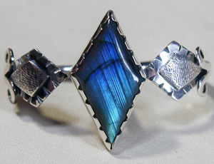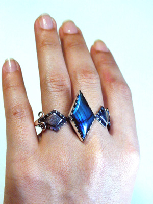 ●N_Ring12● SOLD OUT ![]() 2本の指につけていただくリングです。 ***シャープなひし形で、青い反射がきれいに出たラブラドライトを配しました*** この石について>(不要なノイズからシールドし、 直感力、洞察力をもたらすといわれています)