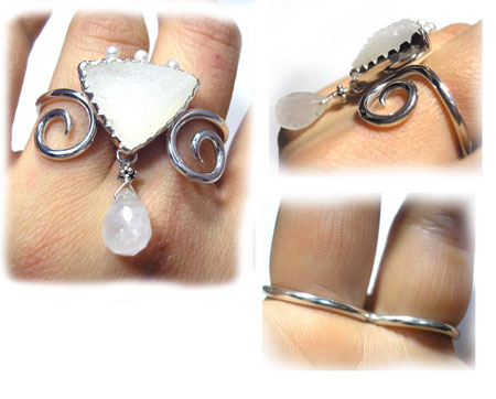 きらきら(結晶)メノウを、 涼やかな、Wリング(2本の指につけるリング)にしました。 上質なベビーパールと、乳白色のカット水晶が、 清楚ながらも上品な華やかさを演出してくれます。