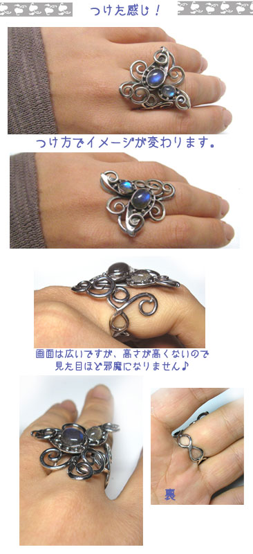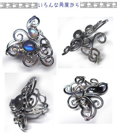 2石のラブラドライトを、つたが絡むようなリングに仕上げました。