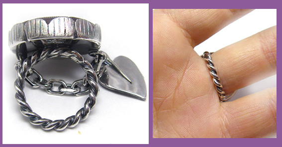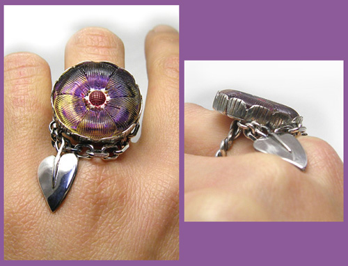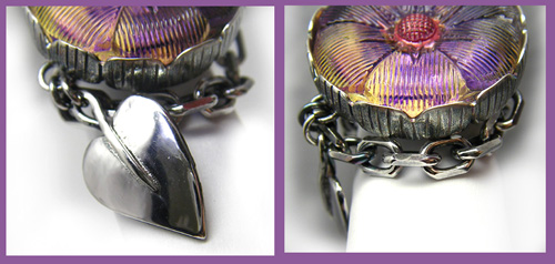 | この妖しげなお色のお花を引き立てるべく、チェーンと いつもよりちょっと厚めの地金で、葉っぱモチーフで飾りました。 |