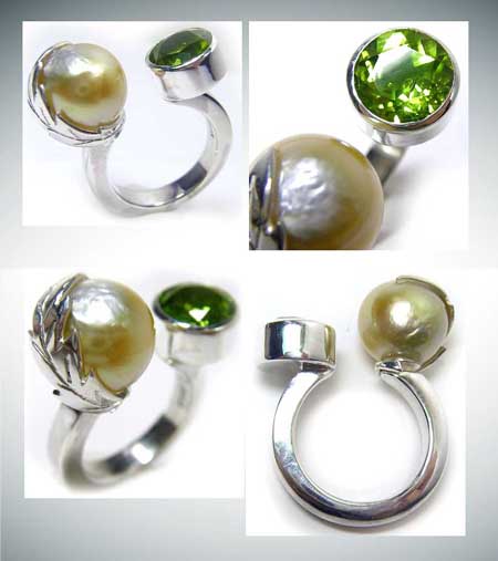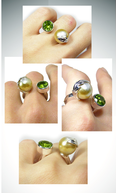 きれいなイエローパールと、ペリドットが、 ジュエリー感たっぷりの雰囲気を演出してくれます。 大きめのカットペリドット、フェザー(羽)を思わせる葉っぱモチーフが やさしく包むイエローパールの色合いのいい組み合わせです。 土台は、3mmという厚手の地金板から削りだし、 握りの部分は当たりよく丸く、サイドはシャープに仕上げました。 優雅な雰囲気をかもし出すリングです。