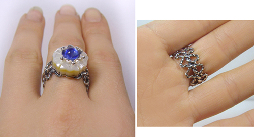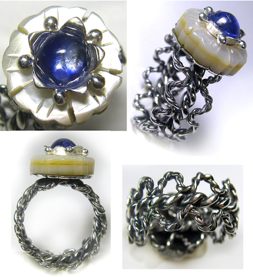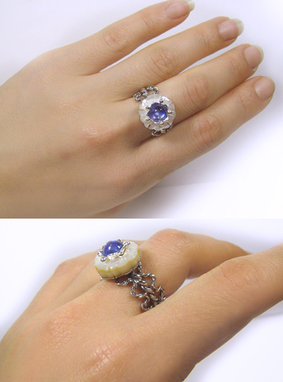 お花カットのシェルにブルーのサファイヤが輝く・・・ 大人の品と、清涼感漂うリングです。