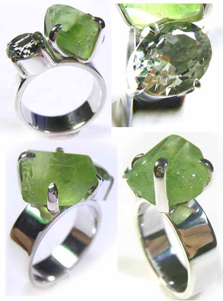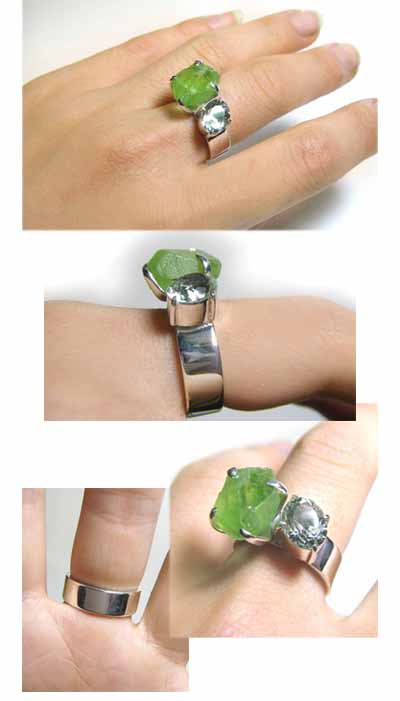 原石に近い素朴な印象のペリドットと、 やさしいグリーン系のお色がきらきら輝くアクアマリンをシンプルなリングに仕上げました。