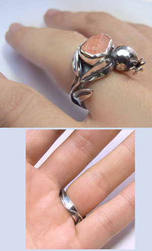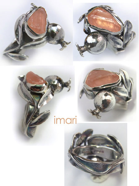 | ハーキマーダイヤモンドと出会わせてくれた、海外の石屋さんイチオシ! で仕入れたエオスフォライト その中でも、今回はちょっと珍しい?アフガニスタン産・エオスフォライトの原石 を 産地・アフガニスタンでとれる「ザクロ」のかわいらしい色が この石にとっても似たお色で・・ それをヒントにザクロのデザインのリングを作ってみました。 丸いはじける前のザクロの実のモチーフ・葉っぱも共に銀の地金板から立体的に制作しました。 サイズは11号 同時入荷の在庫石画像がページ、一番下にをご覧くださいませ。 ほかのデザインのリングの制作等、承りますので、 お気軽にご相談ください。 硬度5と硬度の低めのお石ですので、しっかり枠で包みましたが やさしくお取り扱いくださいませ。 |