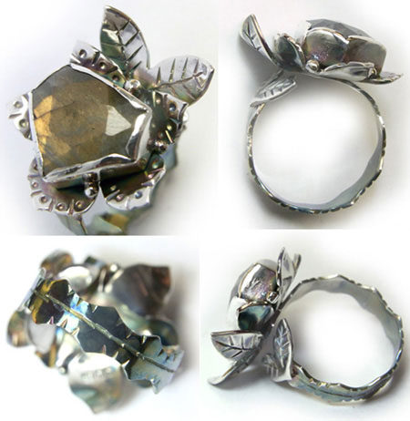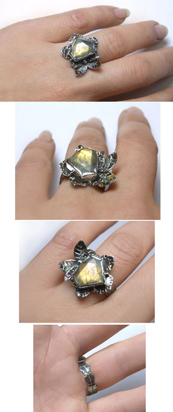 オレンジイエローがきらりと輝く、5角形の ラブラドライトを 草花モチーフとちょっと深めのいぶしで、妖艶な雰囲気のリングに仕上げました。