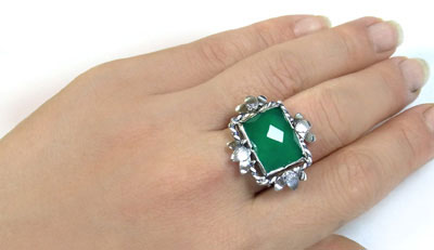 スクエアーカットのグリーンアゲートを、 リーフモチーフでアンティークな雰囲気に飾りました。