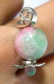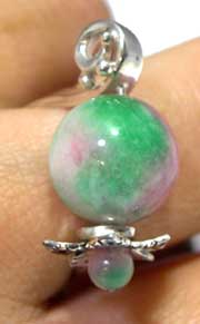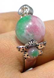 フルーティーカラーのジェードをかわいく シンプルにたのしめるリングです。 ****かわいい色のまんまるのジェードを配しました**** この石について>災いや呪いを退け、精神力を高め、新陳代謝を活発にし 細胞組織の再生を促すといわれています。