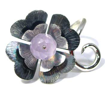クローバーのモチーフを2枚重ねにし、 やさしい色のカットされたカルセドニーを配した