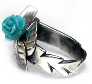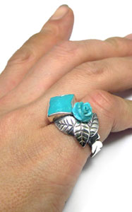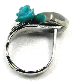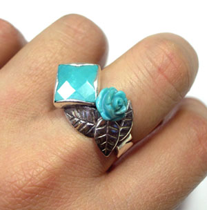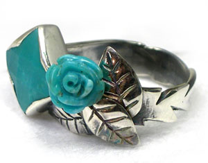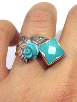 スクエアのトルコ石に、さらにキュートなバラのトルコ石をつかった、 フェミニンで、かっこよさも漂うリングです♪ <この石について> ***トルコ石*** ターコイズは旅人の石と言われ、持ち主に災いが及ぶと身代わりになるといわれています。 インディアンの間では最高の魔除とされています。 o(`_')○えいやー