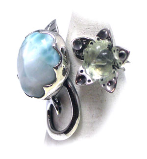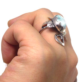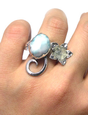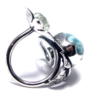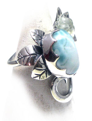 大好きなツル、葉、お花モチーフのリングで作りました♪ お花の中心にはフローライトを配し、さらにロマンチック!? <この石について> ****ラリマー**** ドミニカ共和国の鉱山から産出され、世界でたった一箇所からしか 産出されないということから、大変希少価値が高い石となってきております。 愛と平和を表す癒しの石とされています。 心の奥に隠された怒りの感情を鎮め、自分の間違った観念から解放する力があ 自然と心を落ち着けてくれる究極の癒しの石といわれています。 ****フローライト**** 集中力や、思考力を高めるといわれています。
