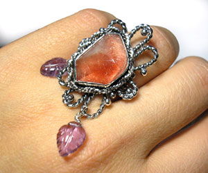 大人っぽくも、かわいらしいリングです。 葉っぱカービングのアメジストがフェミニンな動きを出してくれます。 (形・大きさ等、似た石がございませんので、完全1点ものとなります。) <この石について> *ストロベリークォーツ* 粘り強さと冒険心をもたらし、 ツキを運んでくれる勝利の女神が宿る石と言われています。