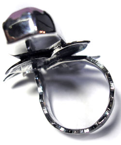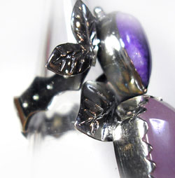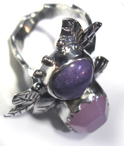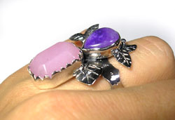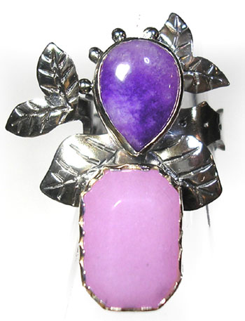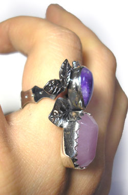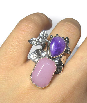 冴えたパープルのヒスイ、甘い色合いのローズクォーツの2石を 森の中の重なる葉をイメージしたリングです。