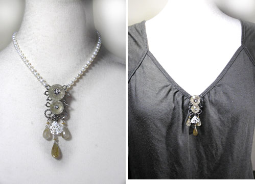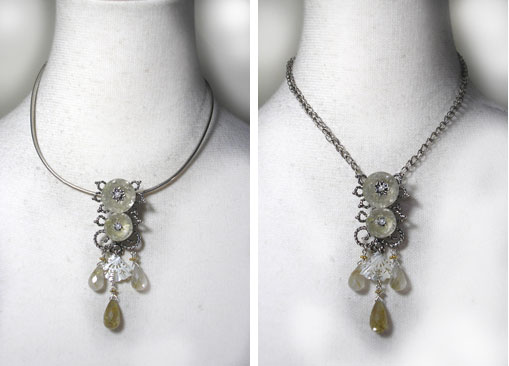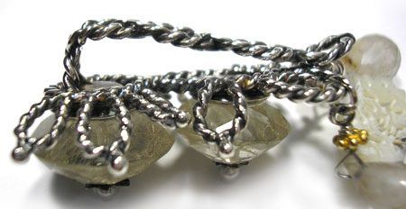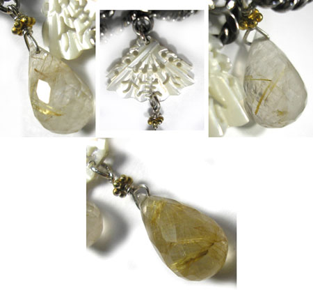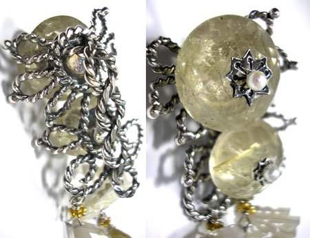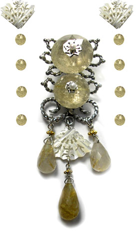 ●N_Top04● SOLD OUT ![]() ルチルクォーツをメインに使った、 ジャポニズムの香り漂う?ペンダントトップです。 繊細なつくりの下がった扇の細工のされたシェルが、 ニュアンスを出しています。 (扇型のシェルパーツが入手困難と予想されますので、一点ものになると思います。) <ルチルクォーツ> 石中の針がアンテナの役目をするとして、水晶の持つ力を増幅させると言われます。 洞察力や直感力を高め、真実を見抜き、潜在能力の開発や向上、 心身の気力の充実に効果があると言われています。