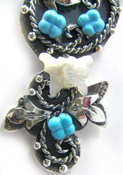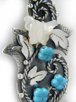 大きめですが、縦長のフェイスですっきりとつけられますね〜。 蝶ちょはシェル、お花はターコイズ(トルコ石)です。