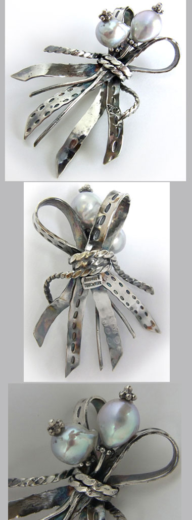 | SILVERを、一本のリボン状に作り、成型し・・・【バロックパール】とともに 【ブーケ】花束・・・のようなペンダントトップが出来ました。 花束って・・・いつでも、いくつになってもうれしい☆そんなモチーフを胸に、お洋服に・・・いつでも飾れたら どんなに素敵だろう・・・の思いをカタチにしました。 リボンの【輪】が二ヶ所あります。どちらにチェーンを通すかで雰囲気も変わります♪ カブトピンでブローチでも楽しんでいただけますよう、 ご希望の方に銀いぶし色の(シルバーではありません。)プレゼントいたします♪ 自分だけの素敵なアレンジでお楽しみください☆ |