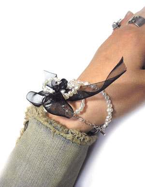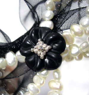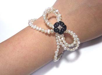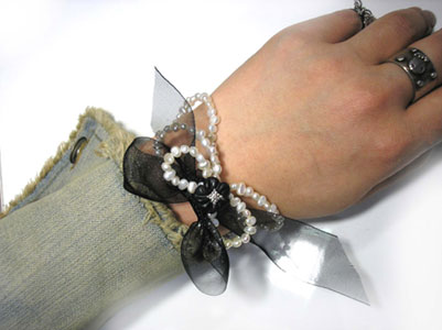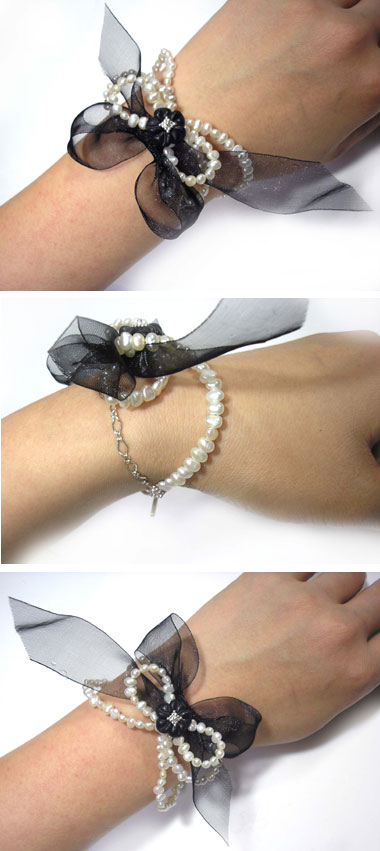 | 淡水パールを2重に巻いて作ったリボンモチーフにふわっと巻いたリボンがキュートなブレスレットです。 つける向きで雰囲気も変わります。横からの見た目もご注目ください. パーティーシーンはもちろん、カジュアルにもお勧めです。 リボンは、取り外せますので、外して使っても、また自分でチョイスしたリボンを結び変えても楽しいです。 ブレス全体に張りがあるので、外れにくい作りになっています つや消しの、お花カットのオニキスは約15mmです。 画像の腕は15.3cmです。サイズご不安な方はご相談ください。 |